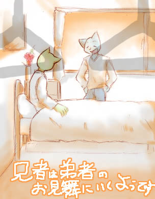 らっしゃいらっしゃいらっしゃい!! ほんと一家の人、これとかドクパンとか連載してくんないかなww ( ^ω^)ブーン系小説の絵を描くようです http://yutori.2ch.net/test/read.cgi/news4vip/1213696990/ 絵スレ……だと……!? な、何故こんな平日しかも週初め月曜の夜に…!!? これからの平日の一週間があまりにも辛い>>1が立てたのだろうか… でもまぁせっかく立ったんですし、 可愛い作品絵もきてるし、伸びたらいいですね~ 目撃できたんで、まとめさせてもらおうと思います。 6/16に頂いた拍手。 >歪んでいるようですと溶けちゃったようですとお留守番の人の続編とミセリ喫茶店と総合短編やばいww そ の ラ イ ン ナ ッ プ。 うん…そういう正直さ……嫌いじゃない、ZE……☆ と、せっかくなので、前々から気になっていた その作品達の超個人的愛情感想↓ 皆、どこかしら歪んでいるようです http://nagixnagi.blog38.fc2.com/blog-entry-820.html (ナギ戦記さま) グロ・猟奇表現注意の、独占欲に満ちた男をはじめとした ちょっと精神的に歪んだ人達を描いた作品です。 これはお好きな人にはたまらないんじゃないかと。 この作品…実は、最初連載になった時にはちょっと残念に感じました。 とゆーのは、最初の総合短編での 「お気に入り、のようです」の時のオチ、まとめ方、終わり方が 凄く好きだったもので…… またナギさんとこのぬいぐるみのイラストが雰囲気とあってて… なもんで、続いたときは あぁーー短編で終わっといてよかったんじゃないかなーとか思いました。 でも、現在3話まで進んでて (確かスレ内で12話くらいになる…って言ってたような…) どうやらこれから色んな人達の話になっていくいようなので、 それはまた楽しみになってますww 他キャラのあらゆる歪み方にキターイ しかし実は兄弟で猟奇は苦手なものでちょっとgkbrしながら読んでたりwww (他キャラなら平気だったりするあたり俺の贔屓目自重しろ) 溶けちゃったようです http://bouquet.u-abel.net/tanpen/melt/001.html(花束さま) 総合でもらったお題を使った短編ですねー。 1回目のスレでリアルタイムで読んでたときは ちょっとボリューム不足に感じたんですが、 付け足し版?はわかりやすくてなっててよかったです。 妹者のとこが特に好きでした。 最後のは、 弟者の体に兄者の人格、だけじゃなくて 兄者と弟者2人の人格が共存した…ってことでいいのかな (理解力不足で申し訳ない…;;) 双子ってとこを生かせてていいなーと思います。 本人たちは幸せなのかもしれんが、ラスト切ねえ…('A`) 総合に、背景に~ってよく描いてる好き絵師さんが この作品の絵を描かれてて素敵でしたハァハァ… >お留守番の人の続編 これ話には聞いてたんですが… 見逃しました……( ;ω;) 探してるんだけど見つからないんだ…まとめられてないのかのぅ… ミセ*゚ー゚)リミセリと喫茶とお客さんのようです (ブーン系小説グループさま) http://boonnovel.g.hatena.ne.jp/bbs/295/1?fromtreemode=1 今楽しみに待ってる現行のひとつです。ミセリカワイスwww 喫茶店バイトのミセリとペニサスと、 ちょっと変わったお客さん達とののーんびりした感じがいいですねー 女の子バイト達のgdgd感が妙にリアルwww 兄弟正直鬼好み(ギャル言葉を使って若者感をアピール)です。 ハァハァ… ショートカットで普通な感じの女の子って、 なんか、こう……いいよね。 >総合短編 時期的にみて、おそらくこれのことかな…? ξ゚⊿゚)ξ 百合/薔薇/愛のカタチ (´・ω・`)(ヴァニラアイスさま) http://stupidrabbits.web.fc2.com/sougou/odd_love.html ふたつの国の、同性愛者の王様川 ゚ -゚)(´・ω・`)たちが 自分の国をいいようにする総合短編。 これも好きでした。 作者さんは感動作と言っていましたがおかしいな感動が見当たらないw クー×ツンよりも、最初のクー×デレのほうにキュンキュンきたのは内緒。 簡単にまとまってて読みやすくて好きでしたw 王様横暴だよ王様。いいぞもっとやれ。 クローン技術があればいいんじゃないかな… 最終的にクローン技術でいいと思うんだ… だからこのままでいこうよ。 兄者はショタ好きになったのかが気になる。 あと、最近読んでた総合短編。 兄者が弟者の見舞いに来るようです。(ヴァニラアイスさま) http://stupidrabbits.web.fc2.com/sougou/forever_brother.html まとめに、投下した絵入れてくれてましたありがとうございます! (開いたときに多分誰よりも私が盛大にフイタと思う) 流石兄弟のちょっと切ない短編。 オチには途中から気付きましたが、 あえて最後を見せない、終わり方の魅せ方が好きでした。 あと、兄者のお見舞い最後のシーンの 一見なんでもなさそうなとこが…ウッ ちょっと色塗りなおし↑。 (実は兄者の足がないとか影がないとかにしてるんですが いまいち目立たなかった…;;) しかし最近兄弟モノで、ちょっと空気が不穏だと どっちかが死んでる可能性を真っ先に考えるようになってしまった…w; だんだん身構え方が どうでしょうの企画時の大泉さんのように。 だって…だって、不意にきたら泣いちゃうじゃ